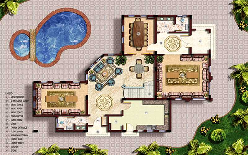 يحتوي المشروع على 6 نماذج سكنية متنوعة في المساحات والأفكار بينما يوحدها الشكل الخارجي للواجهات بحيث تتناغم مع بعضها البعض و تتراوح مساحة الفلل من 500م2 إلى 800م2 وعدد الفلل السكنية 120فيلا.