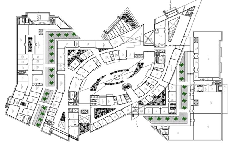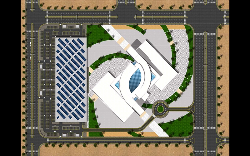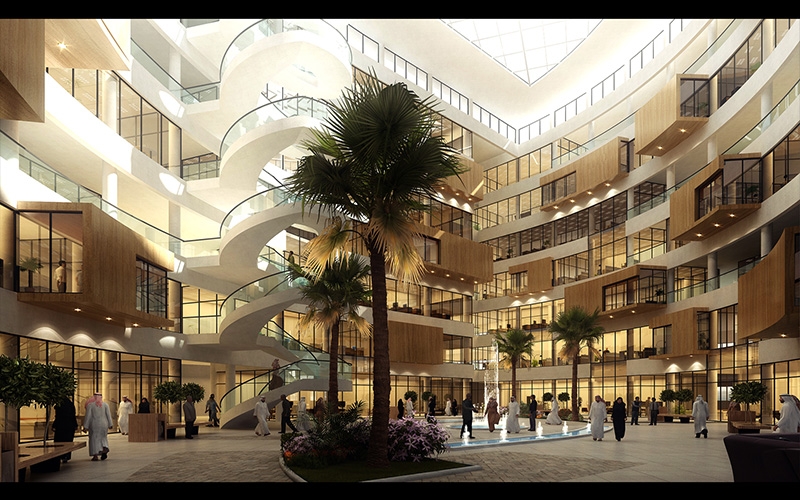 The Project was designed with a design idea that expresses the function of the Real Estate Development Fund by forming the blocks of the main building in the site with a lending icon. The project consists of six components (General Administration Building, Riyadh Branch Building, Multipurpose Hall, parking, Support Services, Security Rooms and Green Spaces).